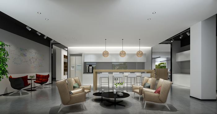 医药办公室茶水间设计:此处由茶水区、交流区、休息区、吧台区构成,不论多少的设计,目的只有一个就是让员工的身心在这里得到休息,在快速发展的社会中一个休息的港湾尤为重要。
