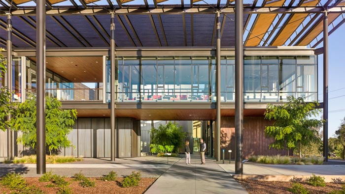 办公楼进门区域的设计:顶部折叠的设计,可以将强光挡在遮光板之外,让光经过阻挡后变为柔光,这样的转换让人可以免受强光的照射,同时遮光板也有吸收太阳能的作用,经过专业设备的转换,为日常照明、工作提供了免费的电源,设计与设计之间环环相扣,让厂房自身的节能趋于完美。