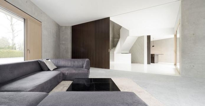 L 形状别墅是一个同时包括办公区域和公寓区域的单户住宅,它被雕刻成一块巨大的混凝土石,看起来就像是内外都是混凝土,而没有任何隔断和涂层。