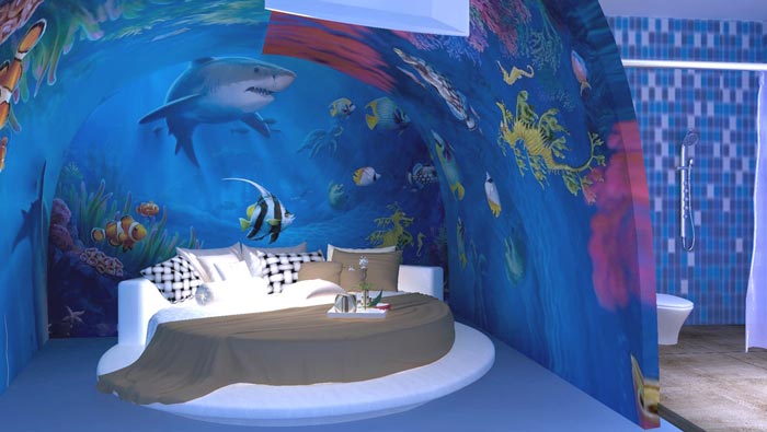海底客房的设计:在此次恋人们仿佛变成了无忧无虑的鱼儿,去探险那未知的海底世界,在这里他们会见到千奇百怪的海底生物,设计师希望让他们,在这里来一次十分有意义的旅行,以此填补人们对于海底世界的无知,给恋人们一个美好的旅行,属于两个人之间的秘密。